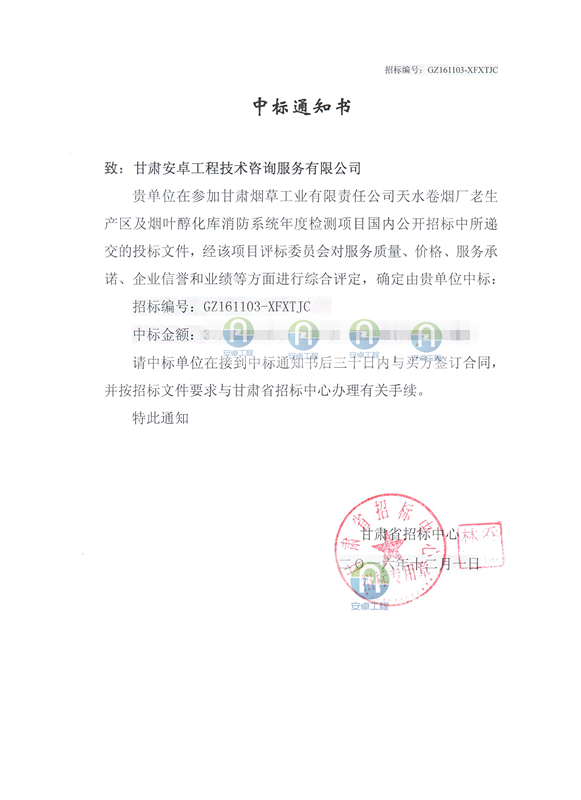 【中標公示】天水卷煙廠消防系統(tǒng)年度檢測中標通知書