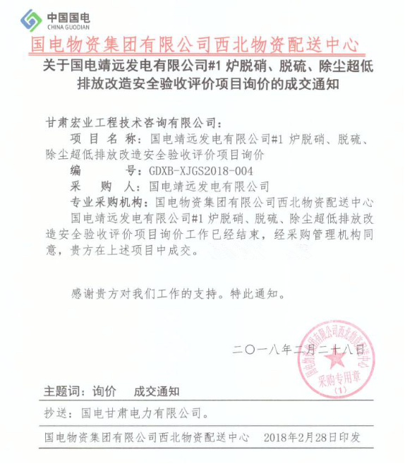 甘肅宏業(yè)工程技術(shù)咨詢有限公司中標(biāo)國電靖遠(yuǎn)發(fā)電有限公司#1爐脫硝、脫硫、除塵超低排放改造安全驗(yàn)收評(píng)價(jià)